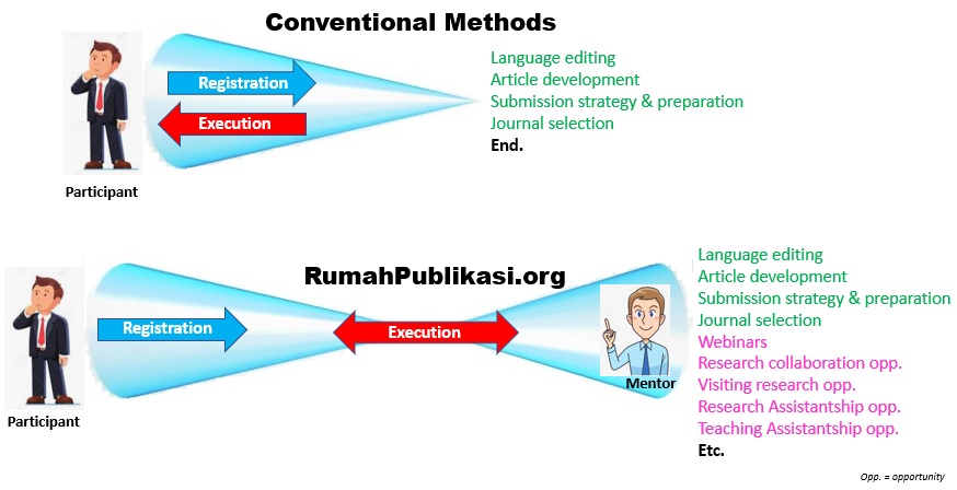 A: Fokus utama program RumahPublikasi adalah pada penguasaan keahlian publikasi karya tulis ilmiah secara individual bagi setiap peserta (member), tidak hanya semata membantu naskah agar dapat terpublikasi. Penguasaan keahlian publikasi internasional ini hanya dapat dicapai melalui program mentoring atau konsultasi intensif yang dilakukan antara peserta dengan seorang mentor profesional atau pakar di bidangnya. Sehingga, pada akhir masa program, setiap peserta diharapkan dapat memiliki sekurangnya 2-3 naskah terpublikasi di berbagai jurnal ternama dan menguasai keahlian tersebut sehingga dapat terus berkontribusi pada submission naskah secara independent selama karir profesionalnya. Selain itu, setiap peserta dapat melakukan registrasi sebagai mentor dan membantu diseminasi program pada tahap selanjutnya. Detail program mentoring dibahas pada point selanjutnya.